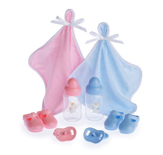 Gemelos rosa y azul abren y cierra los ojos y accesorios